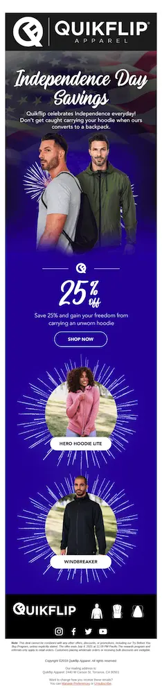 The email also features firework-like graphics and copy that connects the brand’s products to the concept of independence: “Quikflip celebrates independence every day! Don’t get caught carrying your hoodie when ours converts to a backpack.”