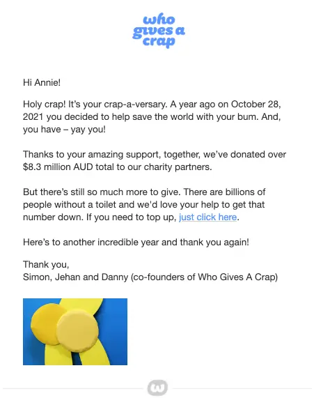 For example, toilet paper brand Who Gives a Crap sent this 1-year anniversary email detailing all the ways they’ve been able to give to those in need based on their customers’ support.