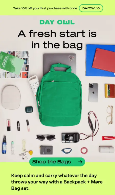 Day Owl takes advantage of email’s ability to show off great product photography. Thanks to minimal copy and an aerial shot of one of Day Owl’s backpacks along with everything that can fit in it, a busy parent may only need a few seconds to be convinced of the value of the product.