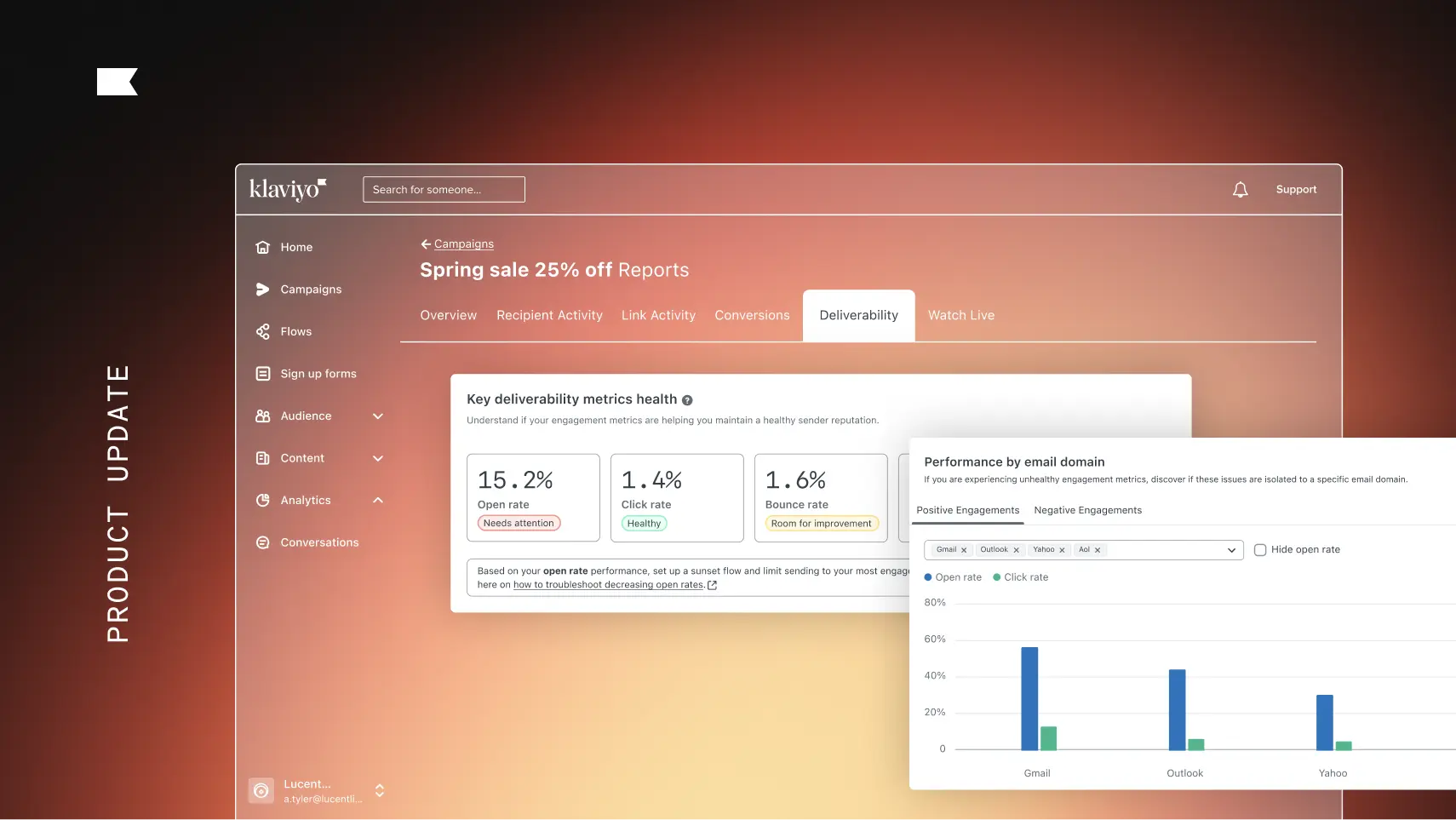 Ensure your emails reach inboxes. Use Klaviyo's email campaign deliverability tab to improve deliverability & reach more customers.
