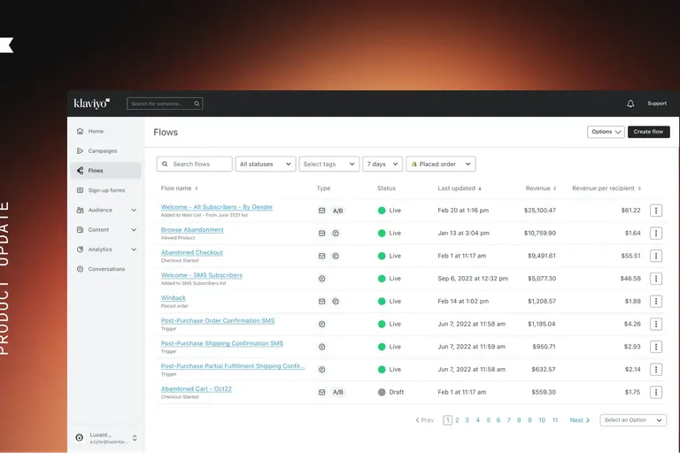 Klaviyo offers a custom dashboard optimized for performance and data for triggered automations or flows for marketers.