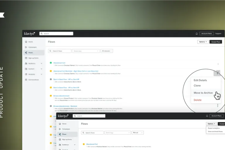 Declutter your Klaviyo account with archived flows for email & SMS marketing.
