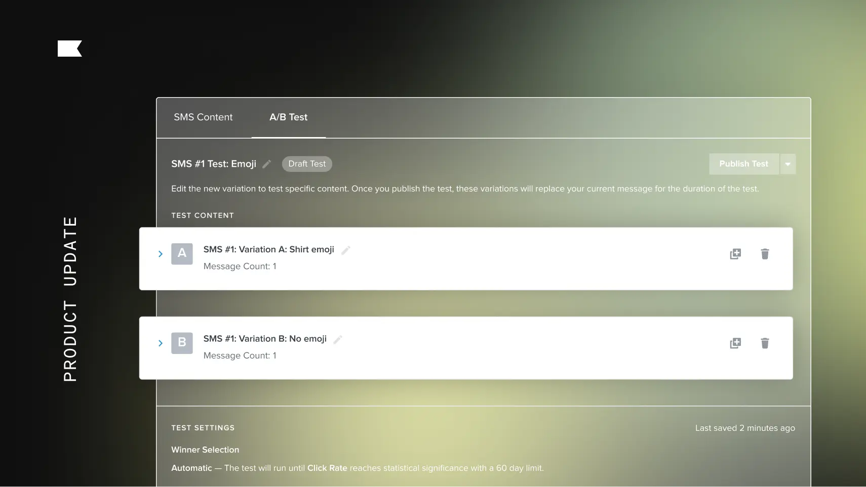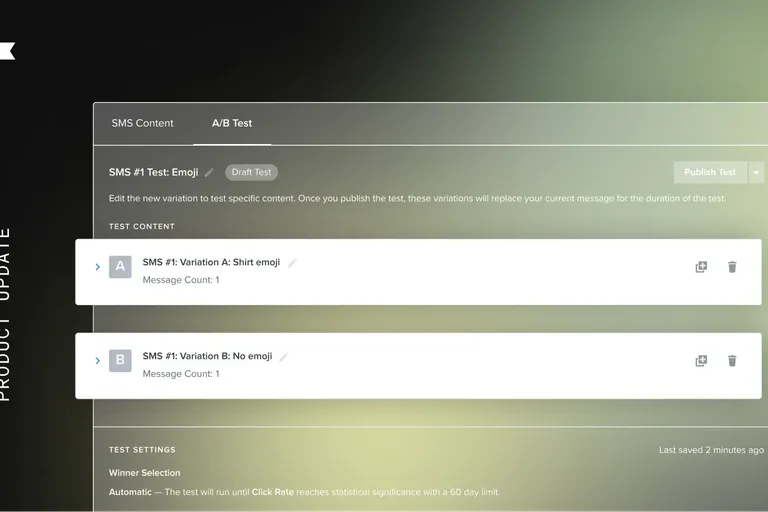 A/B test SMS content in text automations to learn what resonates best with your audience with the Klaviyo sms platform.