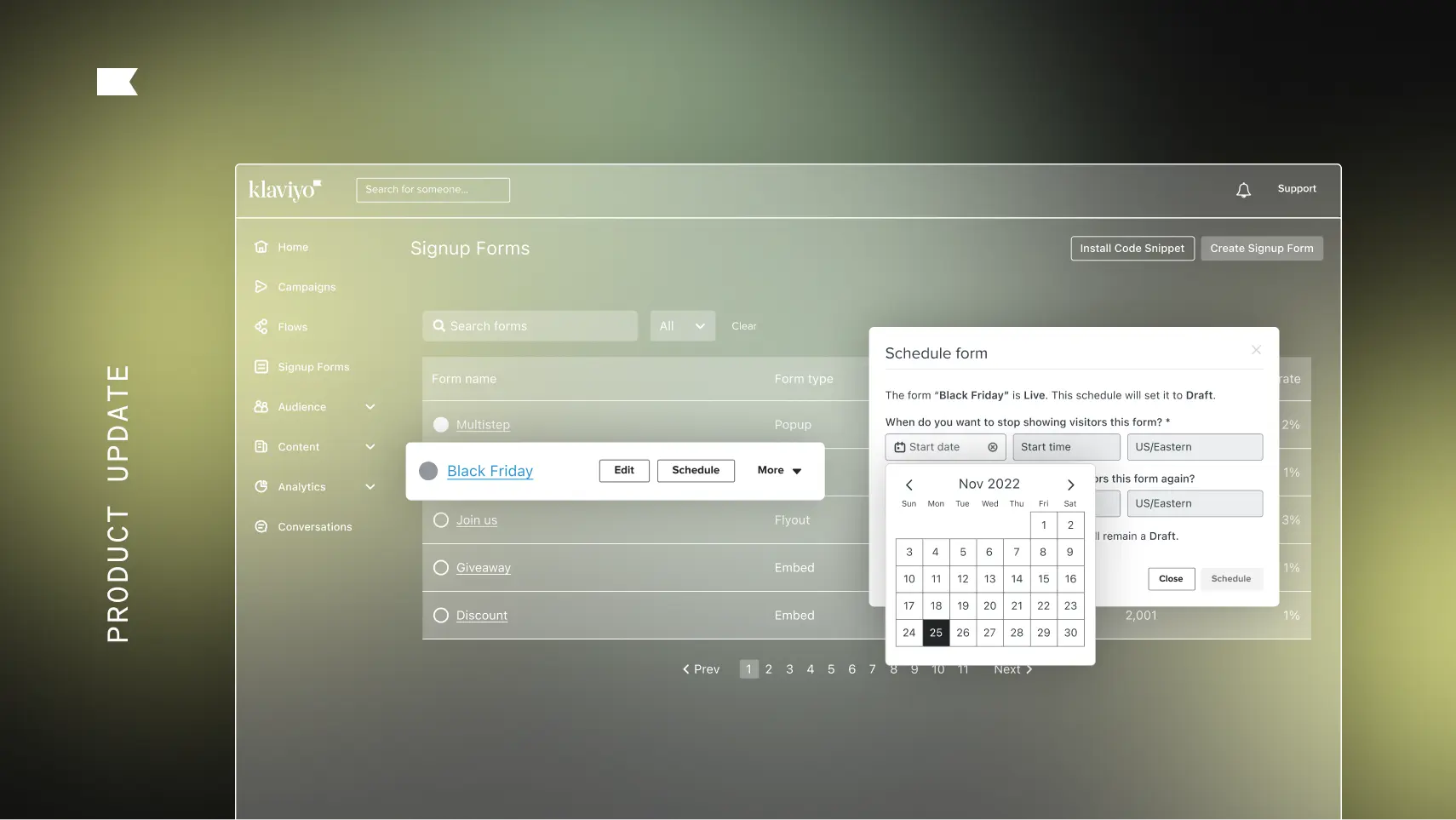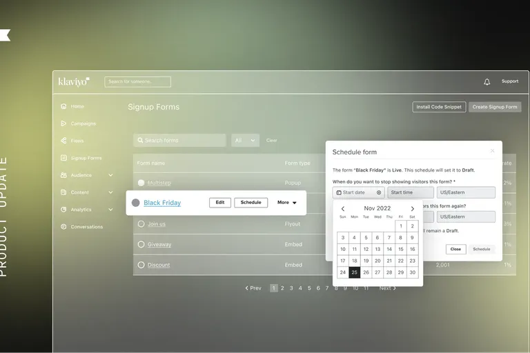 Use Klaviyo to create scheduled forms that allow you to go live and dark, at any time. You don’t have to change your schedule for an upcoming activity.