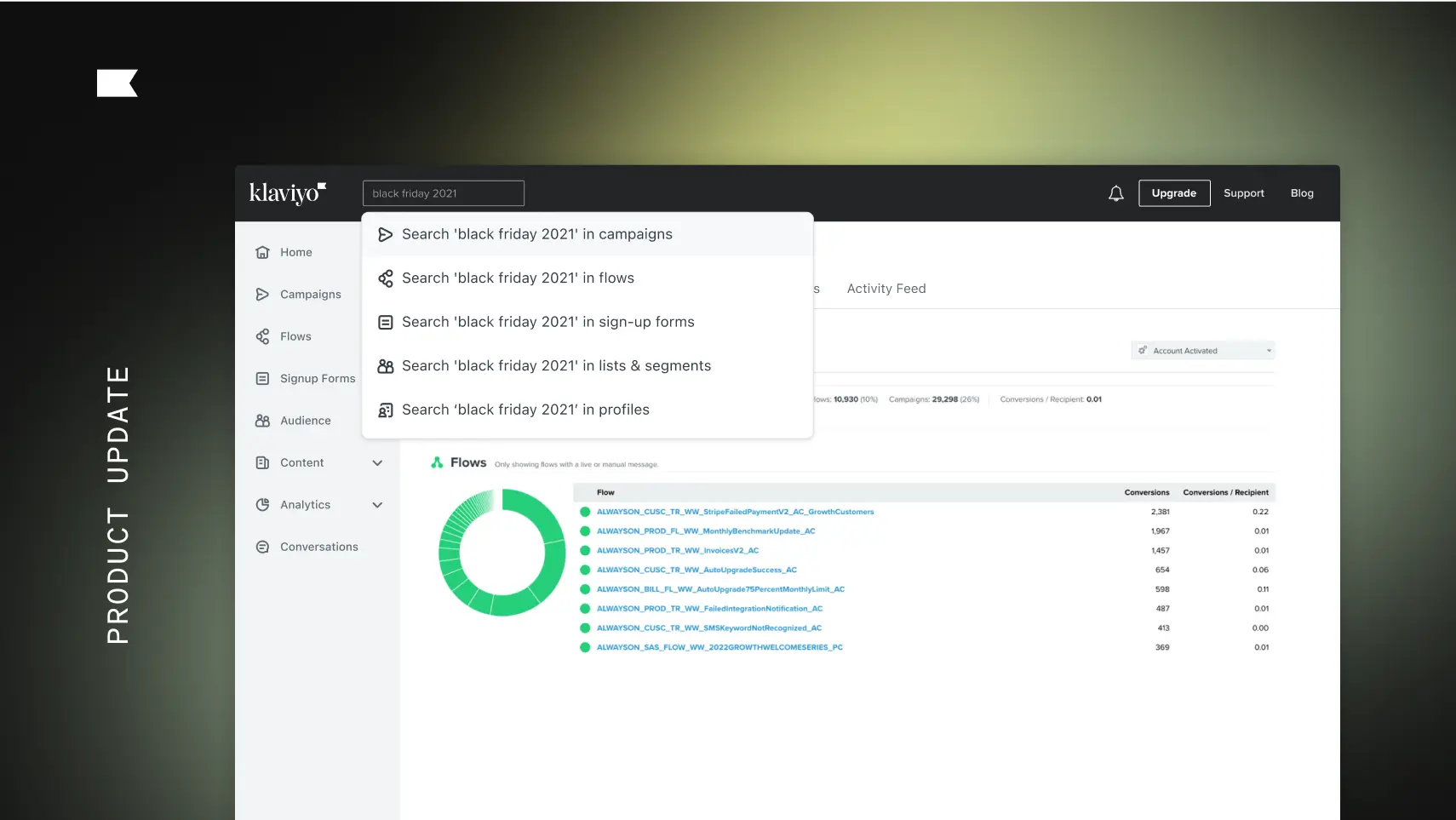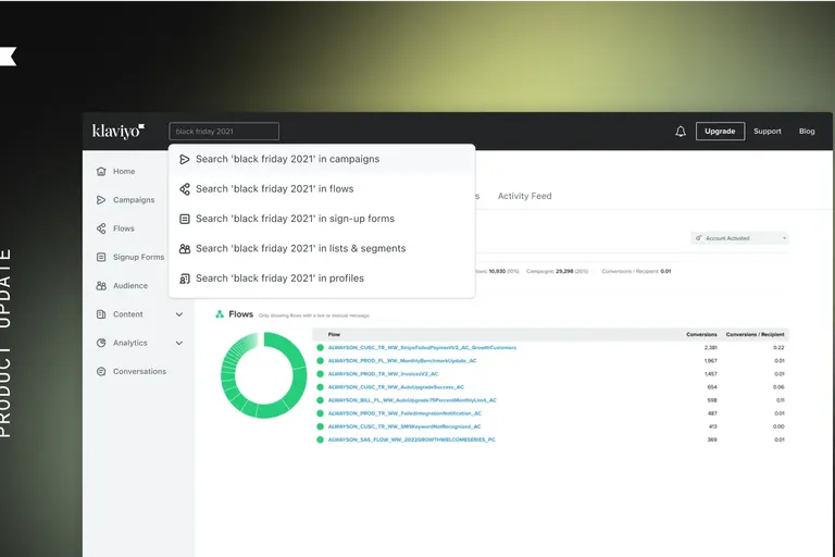 Klaviyo has an expanded main search functionality to encompass campaigns, flows, forms, lists, segments, and profiles.