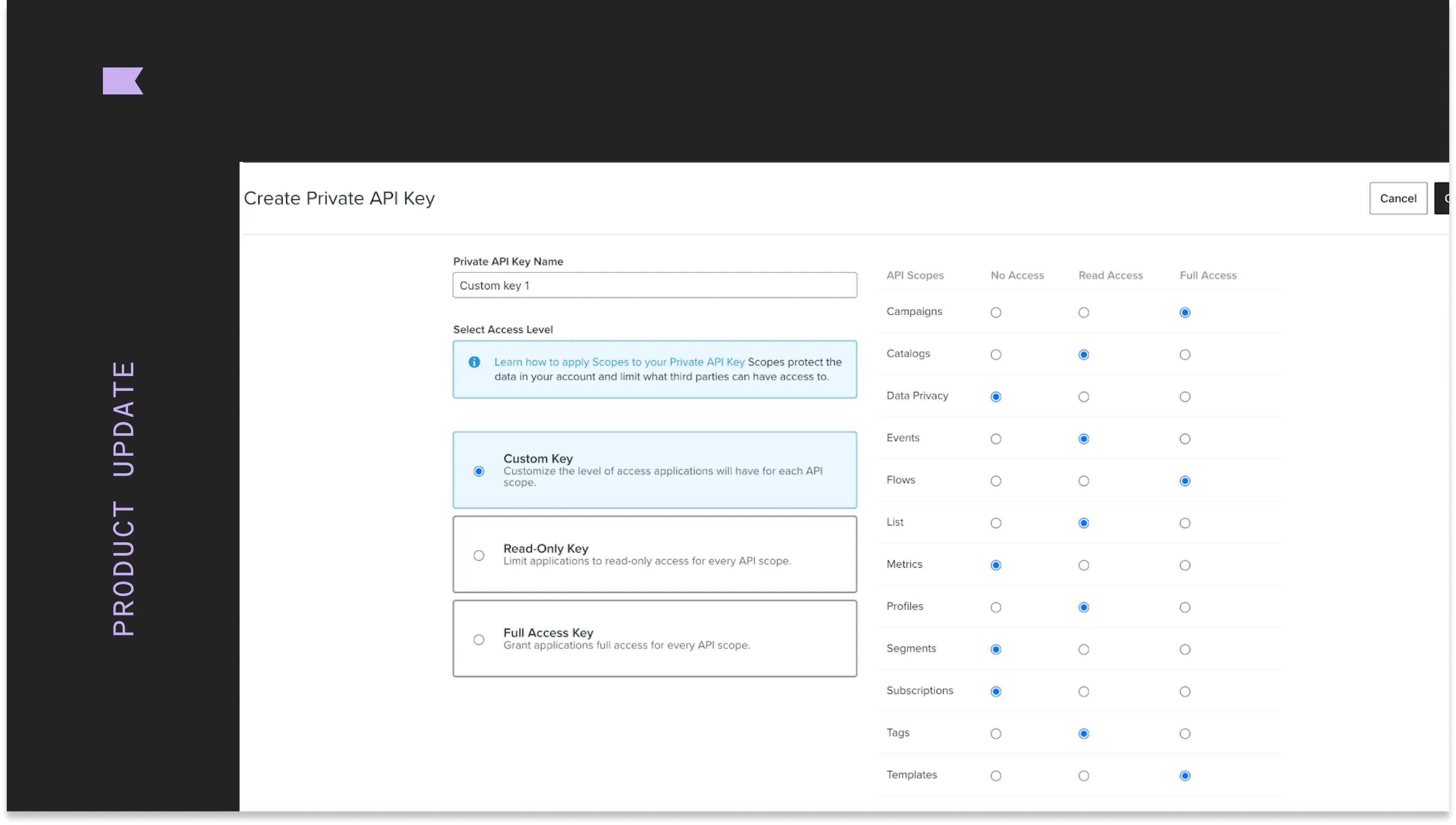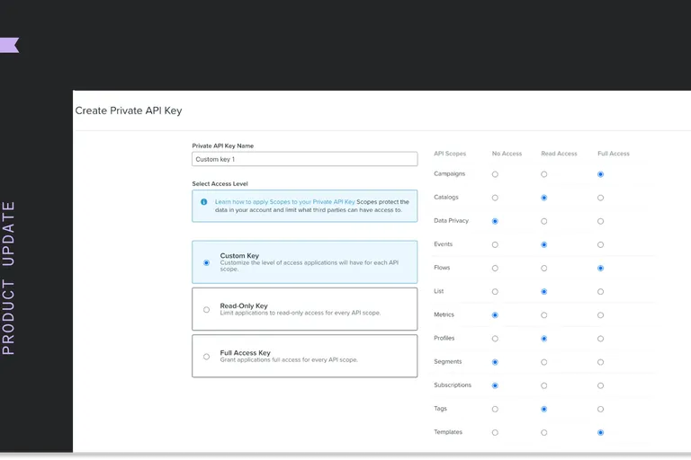 Increase security through scope of private API keys that allow custom access to API endpoints at Klaviyo.