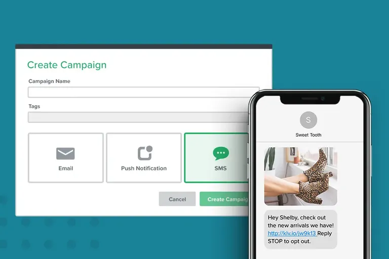 Use a SMS marketing platform like Klaviyo to personalize messages from customer profile data and create MMS & SMS campaigns.