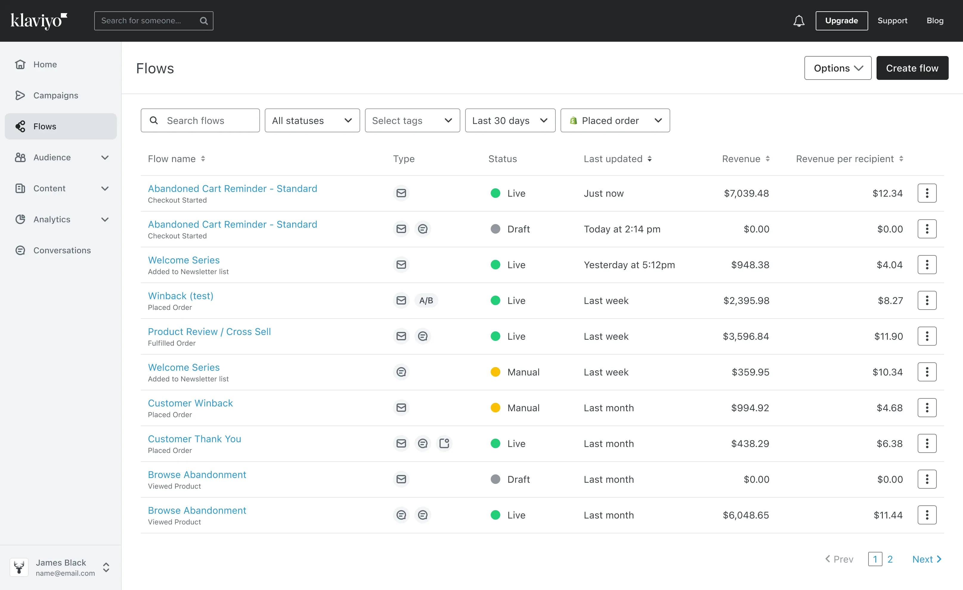 - Sort your list by flow status, last updated, revenue, or revenue per recipient