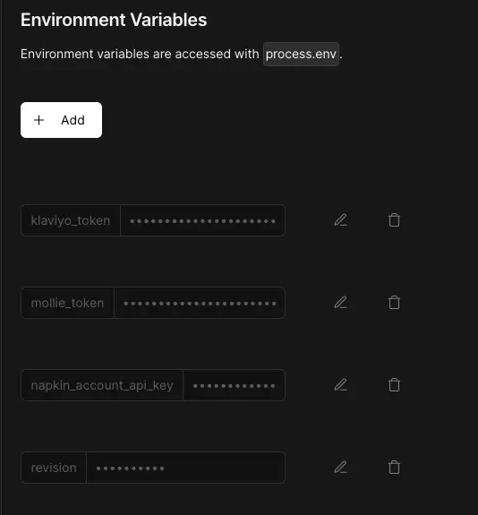 We now need to configure some Environment Variables. These details are required so the function knows which Mollie and Klaviyo account to synchronise data between.