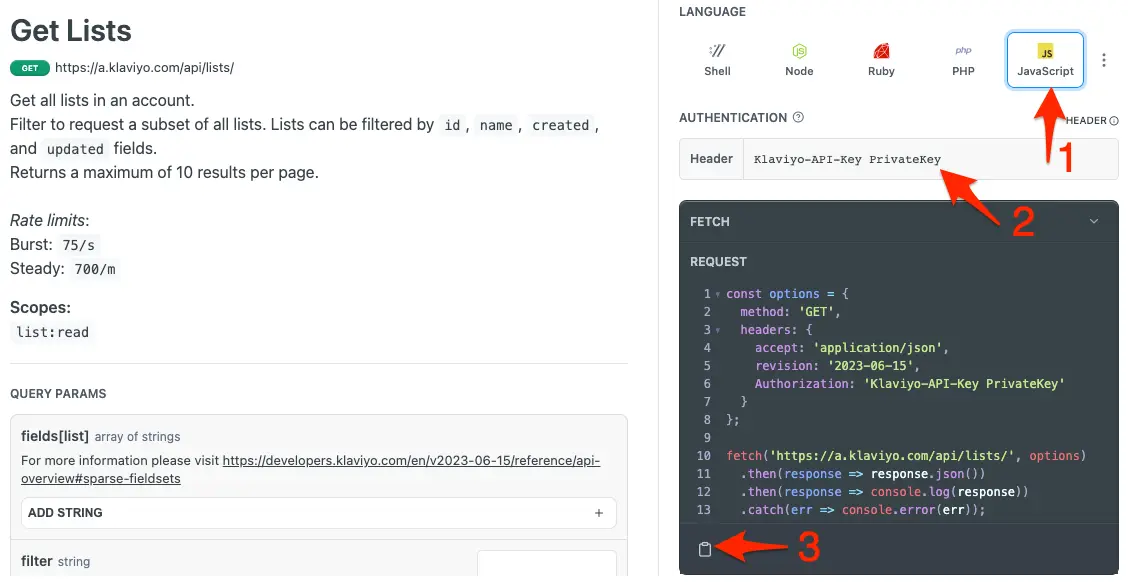 As Klaviyo already provides a full example of how to make the call in the language, we only need to input the Private API Key (With List Read Access) from our account into the field to complete the request –