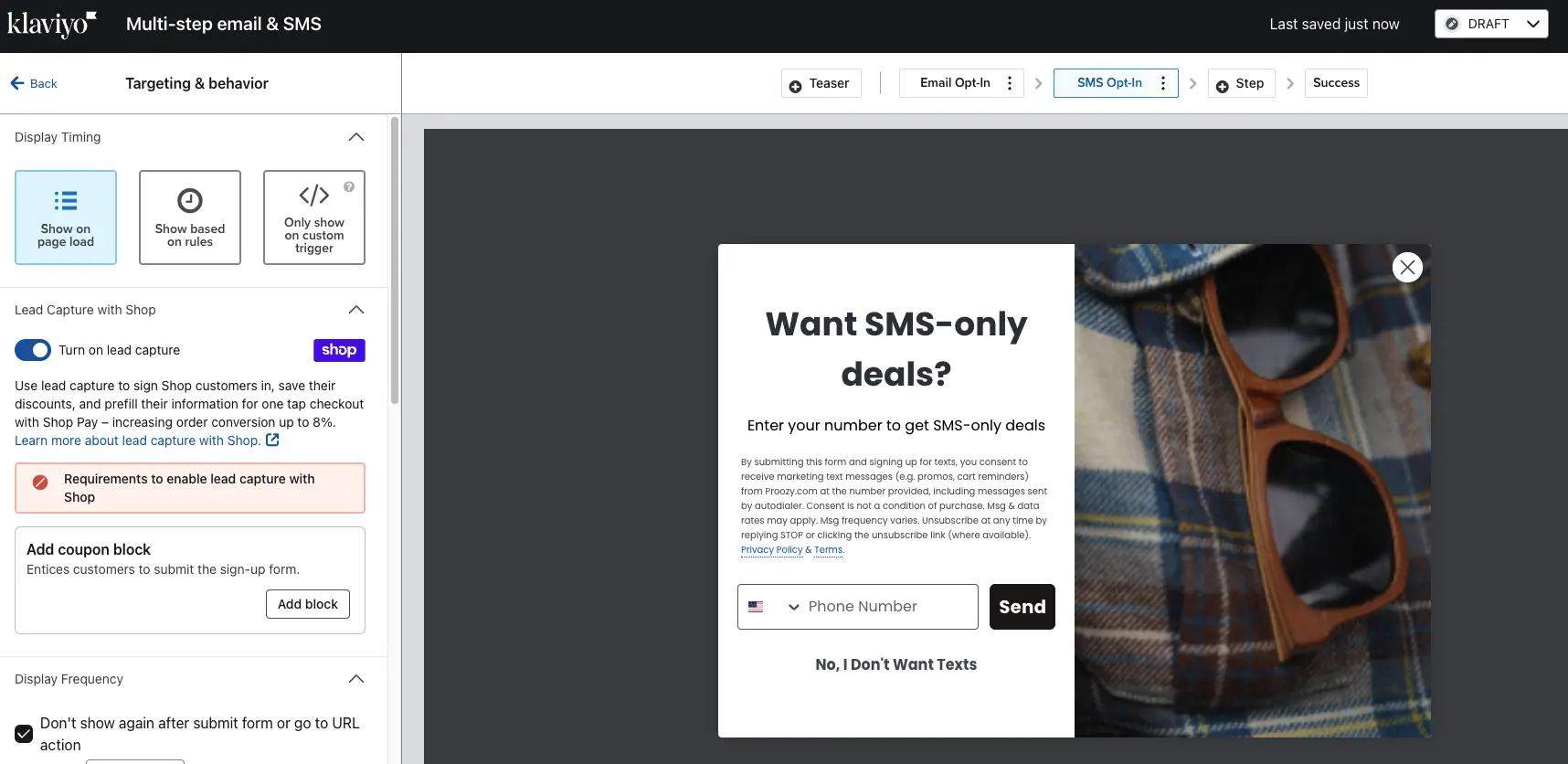 Initially, only forms that offer a coupon and email consent are eligible for this feature. Customers have the flexibility to choose between a single-step form, to collect email addresses only, or a multi-step form that collects both email and SMS consent.