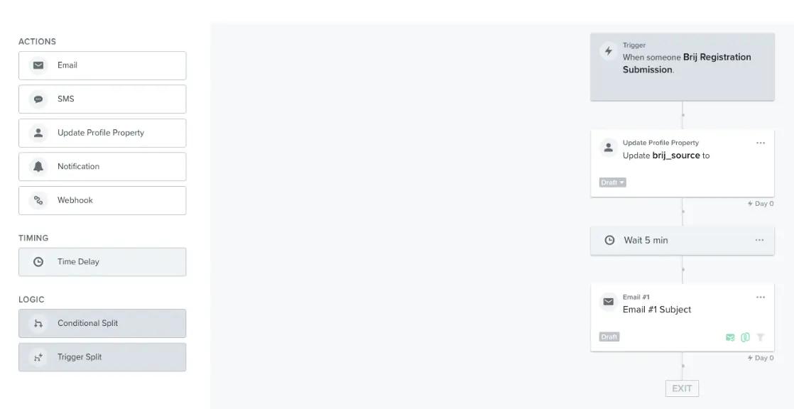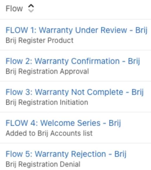 There is a lot you can do with those metrics.For example, you can set up a warranty completion confirmation email flow, or warranty incomplete flow reminding customers to come back to finish their registration.One of the most frequently used flows are metric-based flow, where the recipient will be queued up once the Brij Registration has been submitted. The recipient will have a profile updated automatically and an email will be sent out in 5 minutes after the registration submission.This is what the skeleton of the flow would look like: