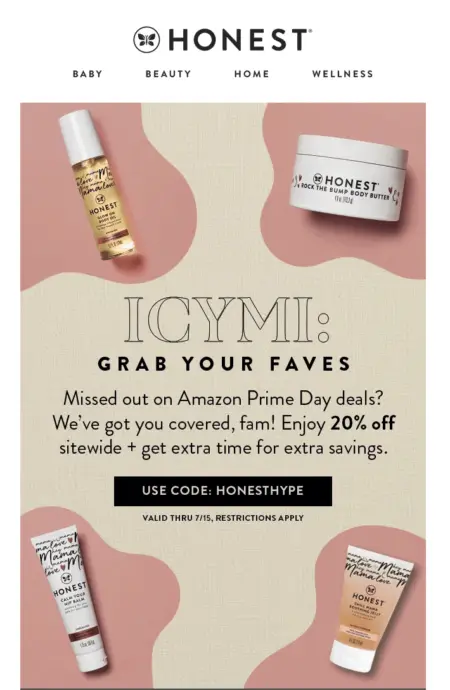 One day after Amazon Prime Day, clean baby product and skincare brand The Honest Company sent this email offering 20% off if readers ordered directly from their site.