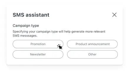 Based on your selection, the SMS Assistant will generate content using verbiage to match. For example, selecting “Promotion” will generate content related to urgency and sales.