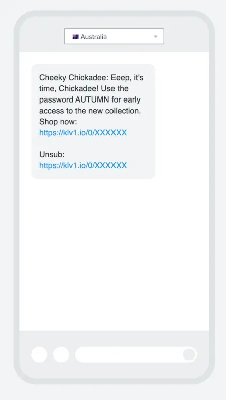 Or consider this early-access reminder, in which kids’ clothing brand Cheeky Chickadee combines a brand-positive greeting with short, direct copy to invite SMS subscribers to access their new fall collection early. The inclusion of a secret password makes the invitation even more enticing: