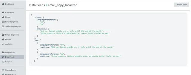 Now that you have a JSON-formatted web feed that is accessible at a persistent URL, you can configure this as a web feed in Klaviyo. So, this step is really simple. Just follow our instructions to Add a Web Feed. You’ll give your feed a name and add the URL from the step above. Here we call it email_copy_localized. Try selecting “Preview” to make sure it’s configured correctly. You should see the contents from the feed appear.