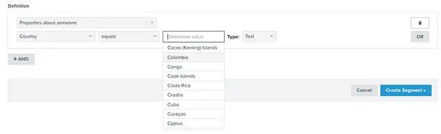 In this case, for simplicity, we’ll only match on a few selected countries, e.g.United States and Canada for English and Spain or Mexico for Spanish. But this can be easily extended by adding more countries with additional or statements. If you need to figure out what values exist for the Country property, a helpful way to determine this is by creating a location-based segment and taking note of the values that appear in the drop-down when you select Country as a filtering condition.