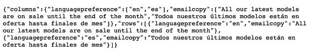 The first step is to organize source content into Google Sheets. For example, we could create a simple table in Google Sheets that includes a column for language preference and a column for email copy. We’ll call the former languagePreference and the latter emailCopy.