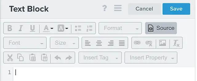 In this case, we want to display the en content to recipients with a Country that speaks English and the es content to recipients with a Country that speaks Spanish. Following the guidelines for how to use web feeds in an email, we’ll add a Text Block to the email and click on the Source button to add some templating code.