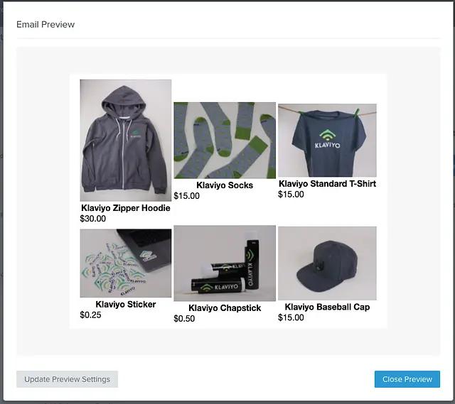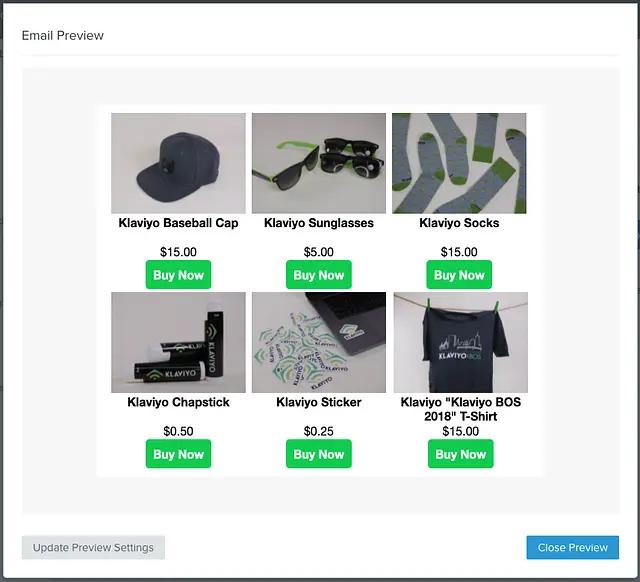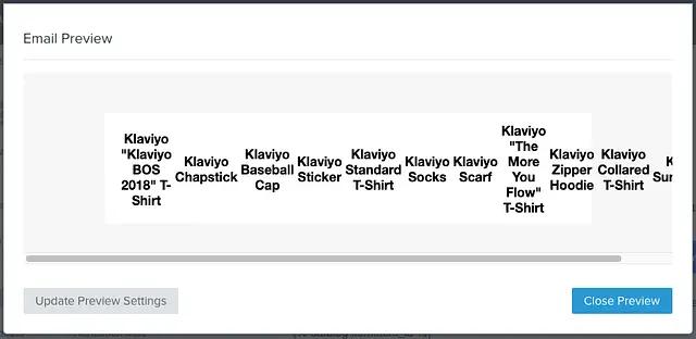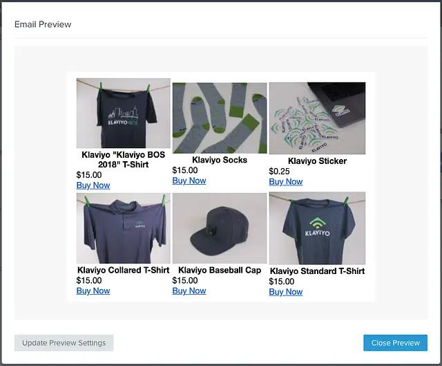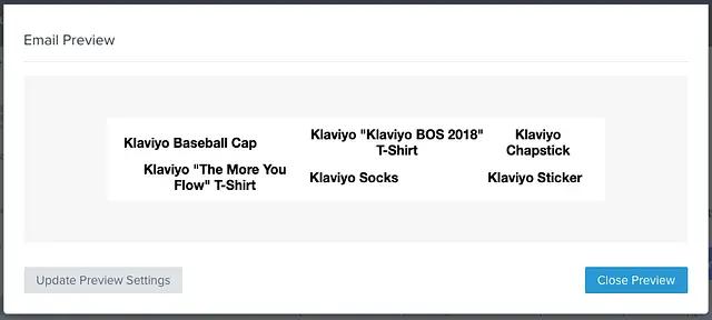 Klaviyo’s template editor allows you to use a preset block called the Product Block. This block lets you choose from a selection of filtered/weighted Product Feeds which pull from your Catalog. In addition to this, Klaviyo provides a range of default Django and custom built template tagging syntax to let you customize the look, feel and personalization of our email templates.