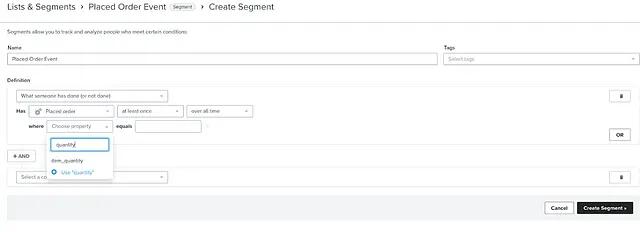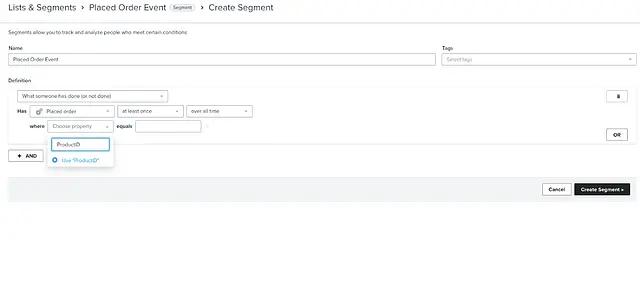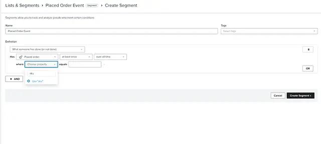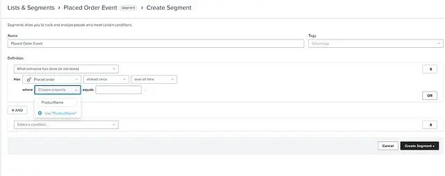 Let’s manually Create a Segment based on the placed order properties passed via the event endpoint for “ProductID”, “SKU”, “ProductName”, and “Quantity” attributes listed in the payload.It looks like the desired properties we would like to segment by are not showing up in the segment dropdown, despite the fact that Postman showed a success message and we can see those properties in the metrics tab.