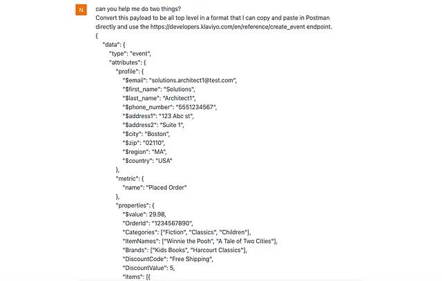 Now that you have a general understanding of OpenAI and ChatGPT, let’s see how the tool can be used in relation to Klaviyo and help troubleshoot technical requests.There are a few ways one can utilize ChatGPT and Klaviyo together. For example, it can help debug one’s code, ask what the given errors mean in Klaviyo and how to change them.Despite ChatGPT’s Thomas Edison Moment, it doesn’t come without drawbacks. In other words, ChatGPT helps modify and troubleshoot the provided source code, but it is up to a developer to have the fundamental background of how things work in order to be able to fully assess the adequacy of responses and ask the right questions in the prompt.When experimenting with ChatGPT, make sure to test the output for code, especially before pasting it right away.Here is one of the code examples shown below: