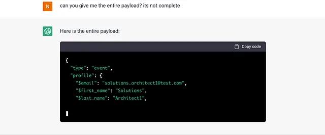 After pushing back and asking the question differently to achieve the desired result, ChatGPT was a lot closer to the result, but it didn’t provide the entire payload, skipping the unique id.
