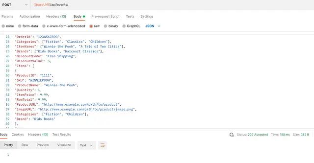 Here is the payload sent via Postman for the Placed Order event:https://docs.google.com/document/d/1GisFZWGVuSiL9LCQYpK8yACQJD_1F4sPEpvOSvdCjvI/editNote: Due to the length of the event data, it’s stored in the google docs above.