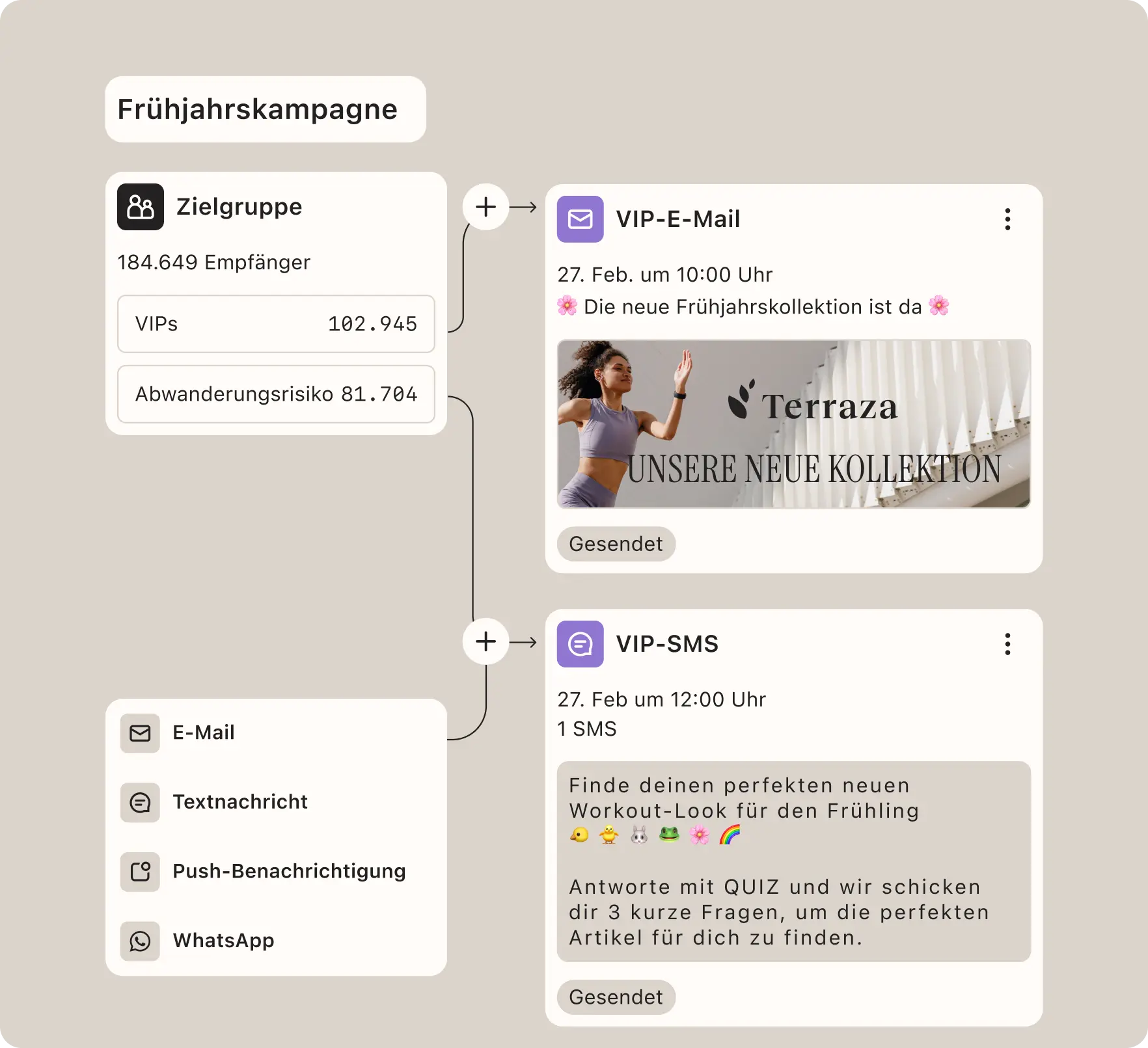 Erstelle mühelos mehrstufige Kampagnen für E-Mails, SMS, Push und WhatsApp.