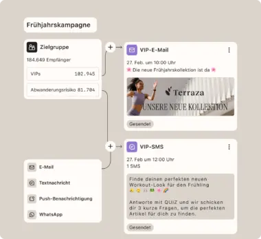 Demnächst verfügbar Der Omnichannel-Kampagnen-Builder: Konzipiere Kampagnen mit mehreren Nachrichten für mehrere Segmente und nutze dafür E-Mails, Textnachrichten, Push und WhatsApp – alles von einer einzigen visuellen Oberfläche aus.