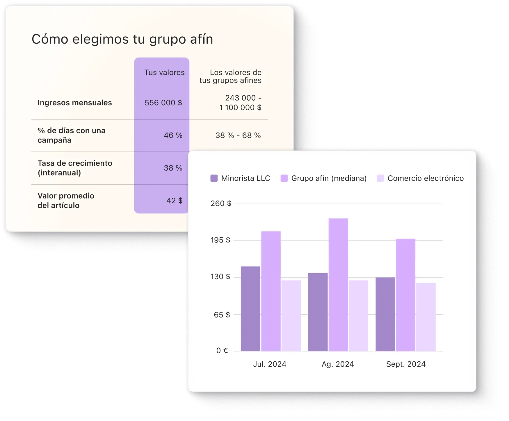 No todas las empresas son iguales, ni siquiera las que pertenecen al mismo sector. Las métricas de referencia de grupos afines de Klaviyo te ofrecen los insights más pertinentes comparando tu rendimiento con el de empresas de tamaño, alcance y posición en el mercado similares.
