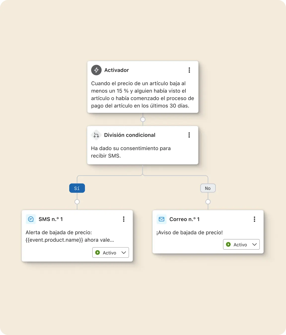 Añade notificaciones push, correos electrónicos o SMS a un flujo para crear un recorrido personalizado basado en el comportamiento del cliente.