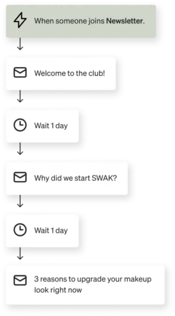 Por ejemplo, SWAK Cosmetics publicó un anuncio para leads que incluía un lead magnet llamado «Cuestionario sobre familias de colores». Era un cuestionario en el que se pedía a los clientes que indicaran los colores que suelen usar, los tipos de eventos para los que se maquillan y los productos que emplean con más frecuencia. El flujo de serie de bienvenida de la marca incluía los siguientes elementos:
