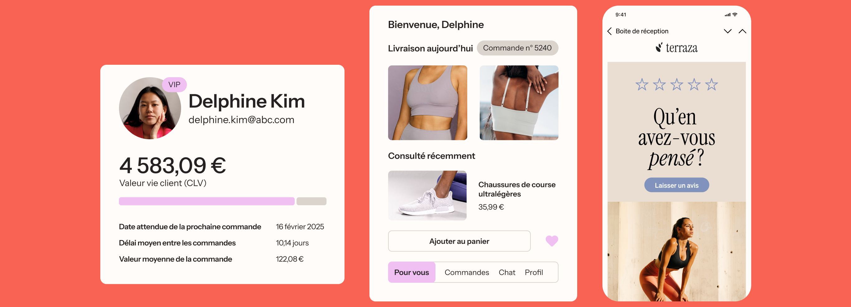 L’e-mail (le canal préféré de Mia) est envoyé à l’heure préférée de Mia, ce qui garantit qu’elle le reçoit au moment où elle est la plus susceptible de faire des achats. Inspirée par les suggestions judicieuses et l’offre exclusive, Mia revient sur le site pour terminer son achat. Elle ajoute même une écharpe assortie, ce qui lui permet d’accumuler des points de fidélité qui l’inciteront à revenir plus tard.