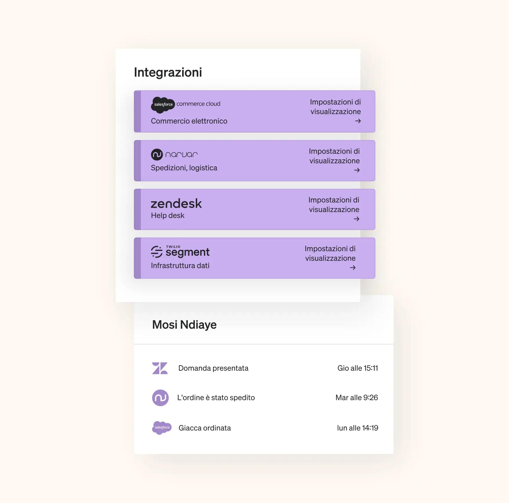 Dedica del tempo alla creazione di esperienze di marketing che lasciano il segno, non alla gestione di un progetto di integrazione. Klaviyo ti permette di accedere a una quantità di dati come mai prima d’ora. Attraverso queste informazioni sui clienti, basate sui comportamenti e sulle preferenze, potrai creare relazioni redditizie e di qualità. Grazie all’integrazione di Salesforce Commerce Cloud tramite API, che configura e sincronizza grandi quantità di dati dei clienti in pochi minuti, le possibilità di crescita sono infinite.