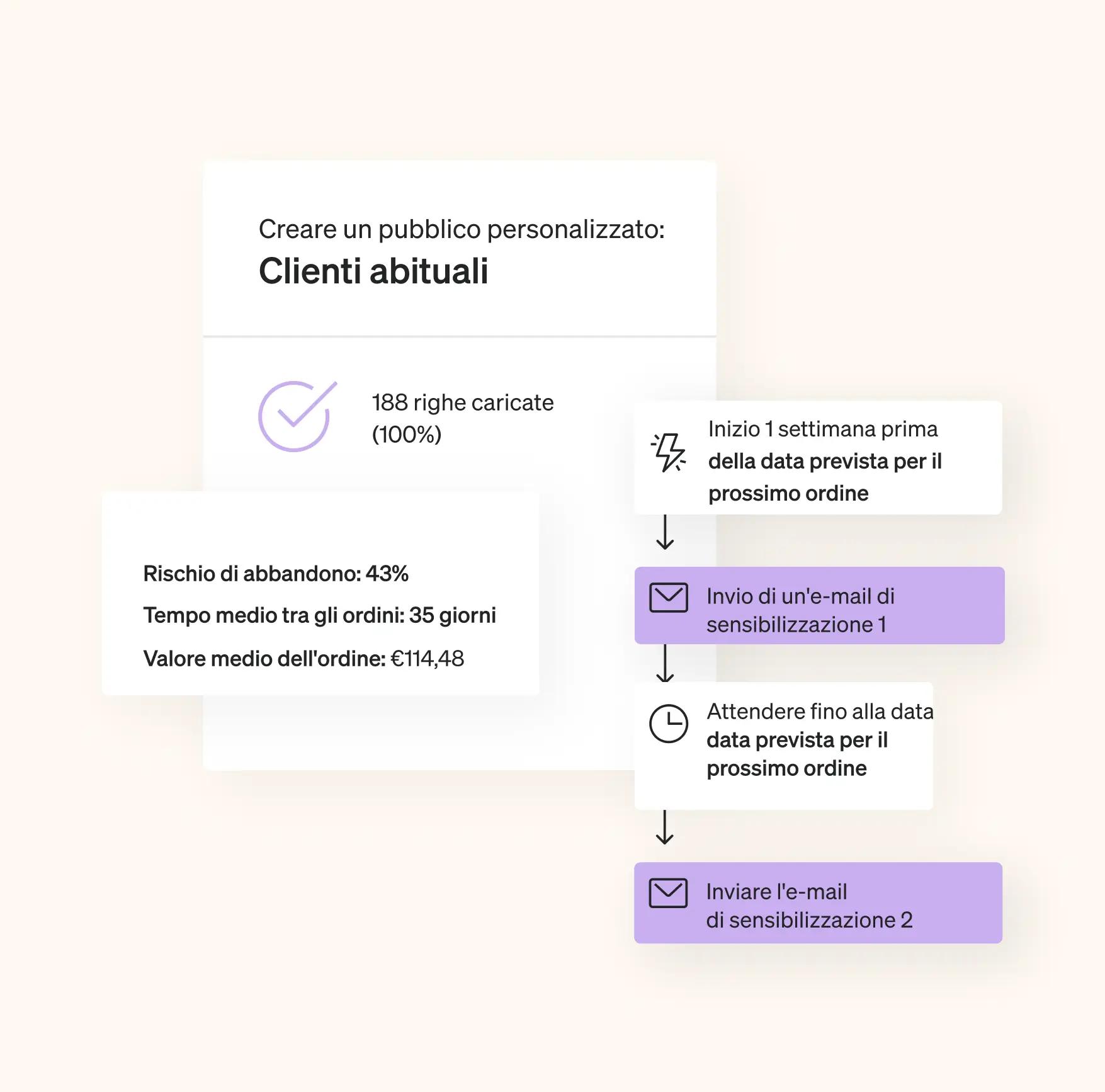Iper-personalizzazione tramite flussi di trigger in base a date, eventi, comportamento degli utenti e altro ancora. Utilizza poi i segmenti, i filtri, i test A/B e molto altro per targetizzare e ottimizzare.