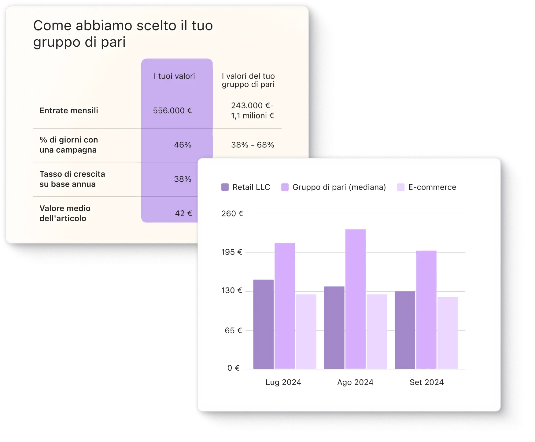 Non tutte le aziende sono uguali, neanche all’interno dello stesso settore. I benchmark dei gruppi di pari di Klaviyo ti permettono di confrontare le tue prestazioni con quelle di aziende simili per dimensione, ambito e posizione di mercato, offrendoti gli approfondimenti più rilevanti.