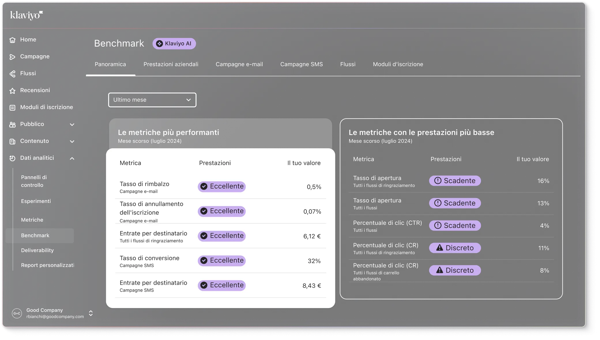 I benchmark di Klaviyo sono automaticamente personalizzati in base al tuo settore e alla tua posizione specifica nel mercato.