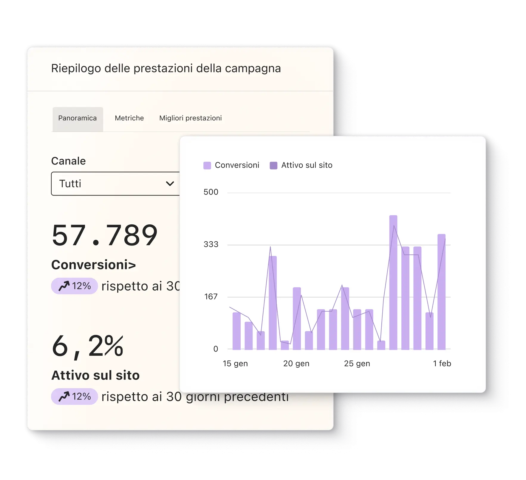 Potenzia le conversioni e la deliverability tramite test basati sull’intelligenza artificiale e approfondimenti che mostrano le prestazioni della tua campagna su ogni canale.