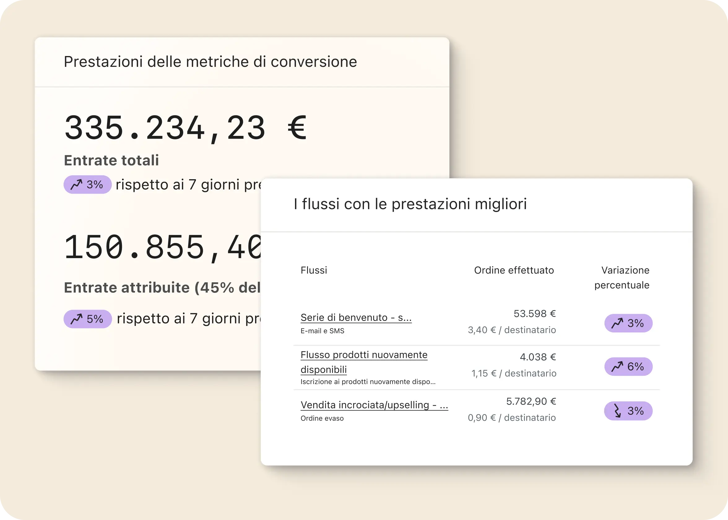 Configura pannelli di controllo personalizzabili per monitorare le entrate e i risultati delle campagne, garantire la deliverability con i controlli e gli avvisi, e tracciare i prodotti e i messaggi che promuovono gli acquisti ripetuti.