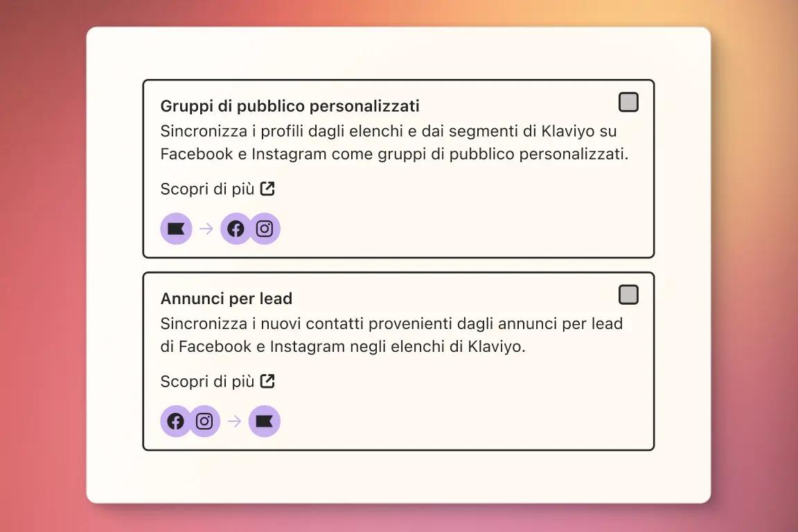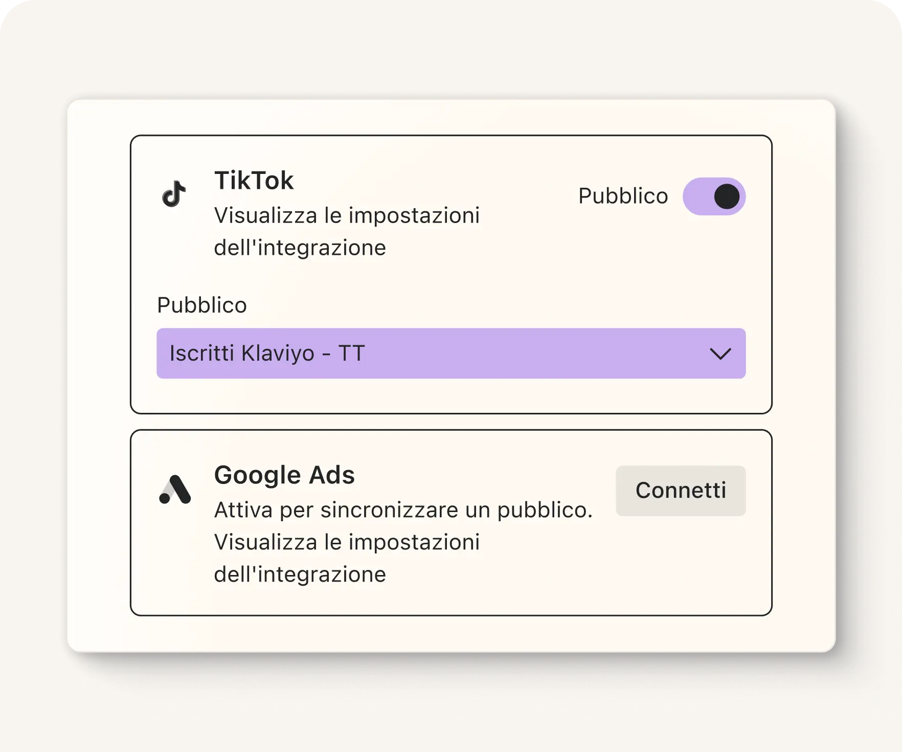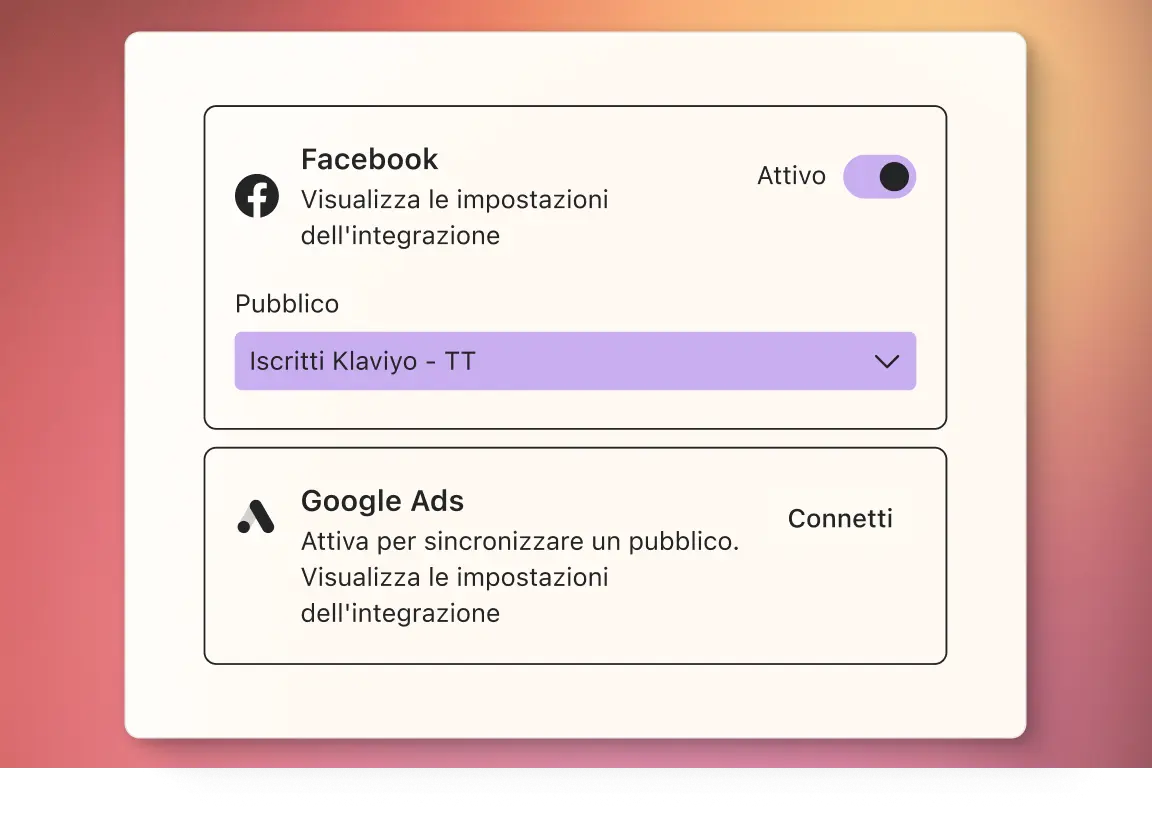 Connetti Klaviyo a tutte le tue piattaforme preferite per creare annunci basati sui dati.