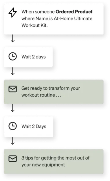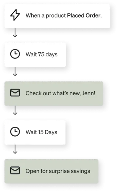 Cross-sell flows are a great way to automatically recommend products that someone might like based on what they’ve already purchased. The key here is to give your customer time to use the product they just purchased before recommending more products.