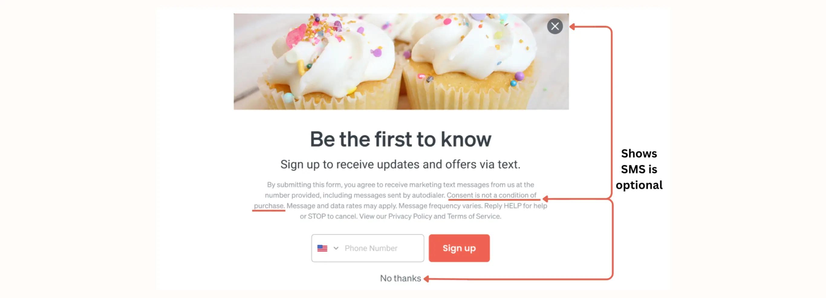 What’s more, users should understand that signing up for SMS marketing is their choice. This is one reason having “separate SMS consent” is important. If you bundle the opt-in for SMS with something else (like email), users may feel like they “have” to sign up for text message marketing. On the other hand, by asking for SMS consent via its own page, checkbox, button, or other action, it’s always clear that the opt-in is for SMS marketing and is optional.