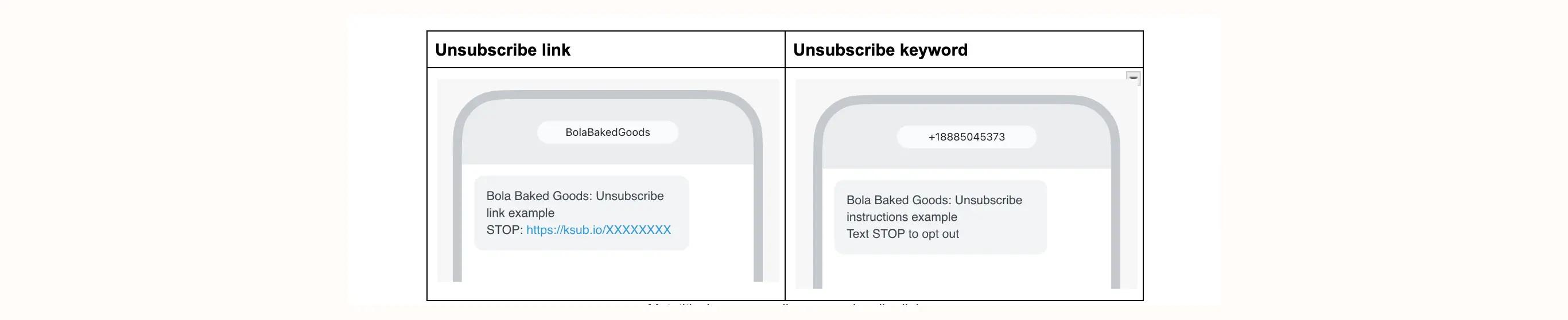 | Details how someone can opt out of SMS, based on the sending number you’re using: Branded sender ID: an unsubscribe link someone can click within the text message All other number types: an opt-out keyword (e.g., STOP) the subscriber can send |