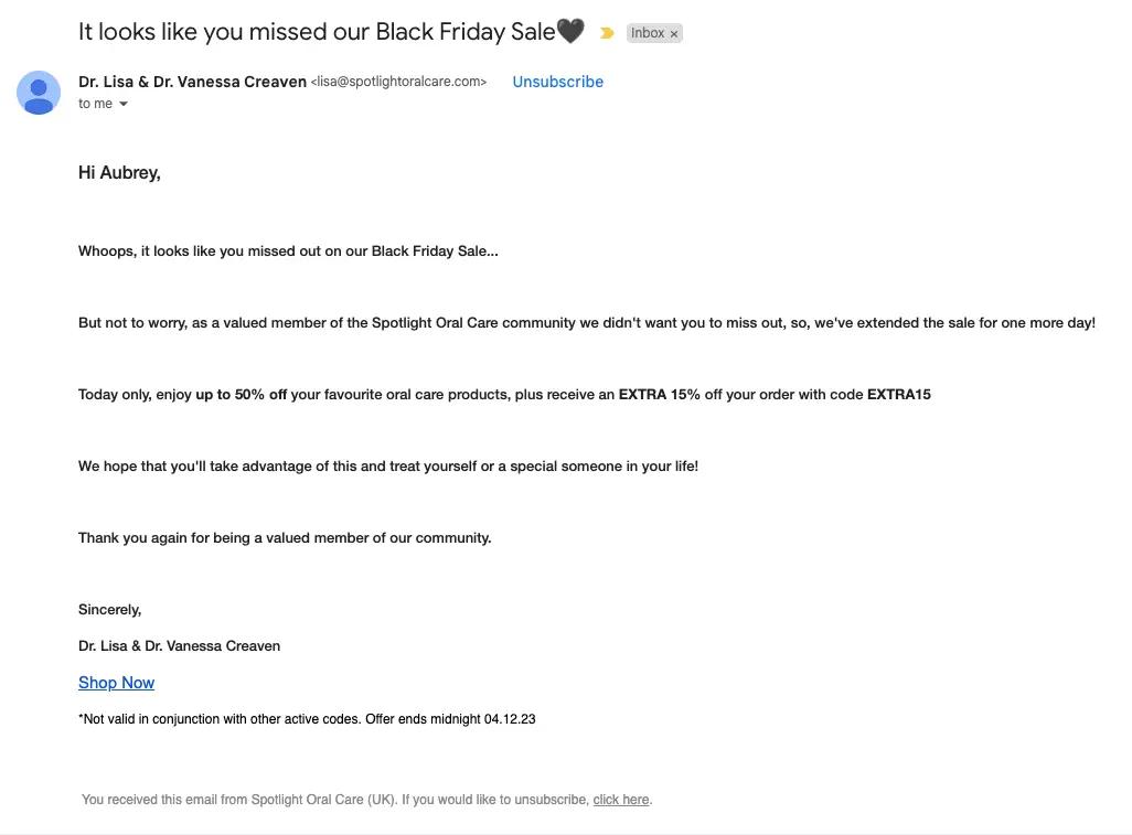 Yes, we’re including another BF email example from Spotlight Oral Care—their emails are just that good. Here, the brand shows off the value of a plain text email to customers who didn’t make a purchase during the Black Friday sale.