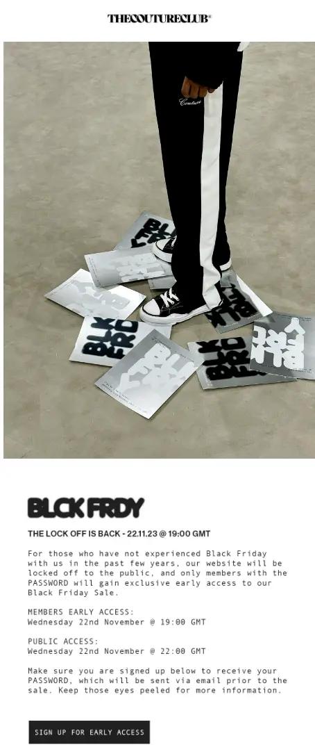 This email from The Couture Club offers the brand’s most loyal customers password-only access to a Black Friday discount—a natural extension of The Couture Club loyalty programme, which frequently incentivises people to shop their clothing line via exclusive experiences.