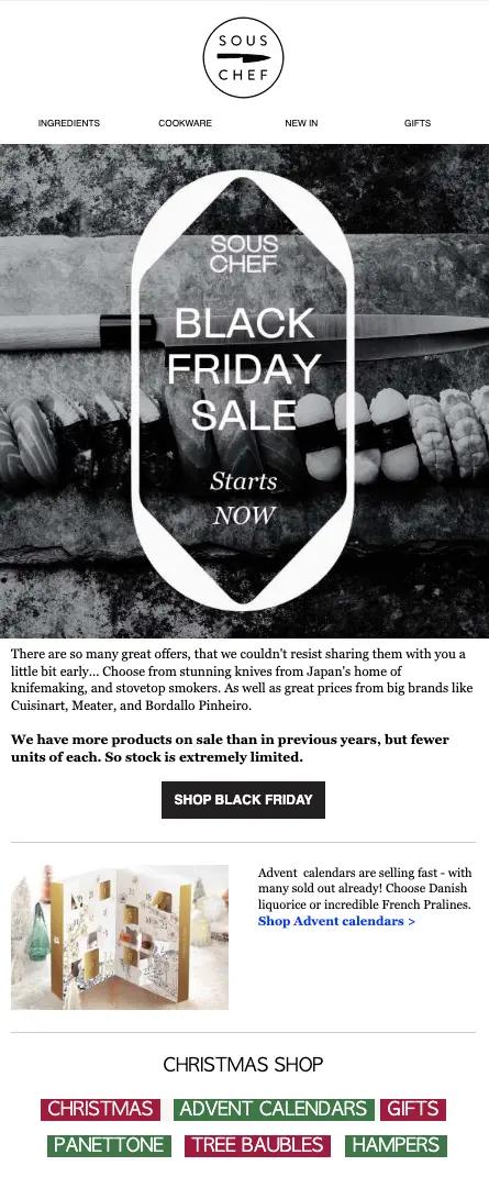 In this BF promotion email, online kitchen goods store Sous Chef educates subscribers about their sale stock—which is limited enough that customers need to act fast.
