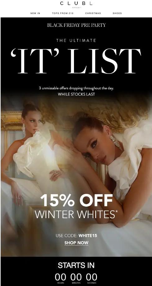 Popular fashion brand Club L London gets subscribers ready for the Black Friday with a day of 3 unique offers. This not only potentially gets customers to shop before Black Friday, but also keeps people excited to watch their inbox for the next offers.