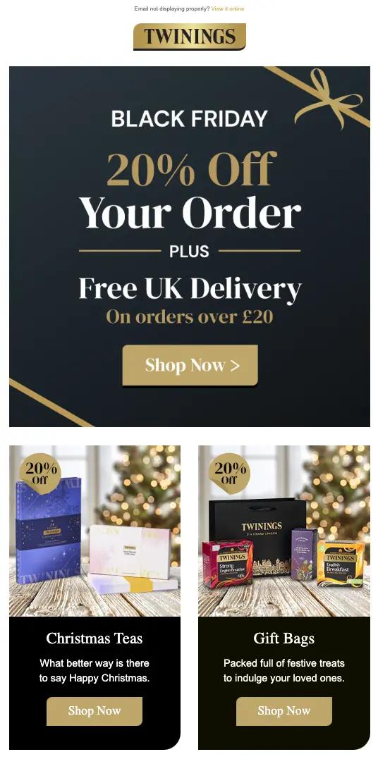 In this email from Twinings, the brand offers free shipping alongside their Black Friday sale, creating a double incentive for customers to shop for their favourite teas.