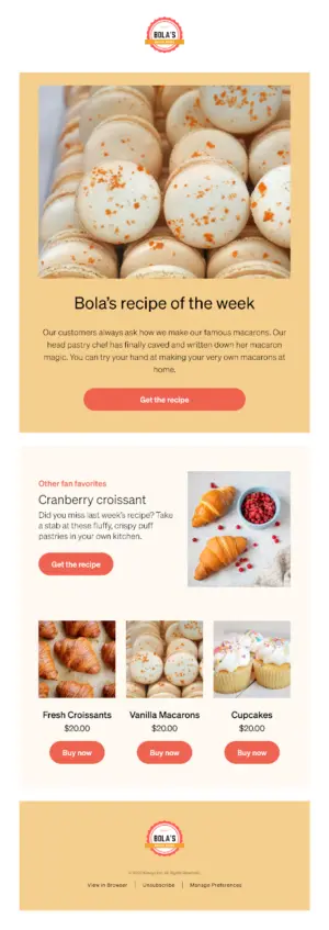 For example, Bola’s Baked Goods sends a Recipe of the Week to their 60-day engaged segment every Friday. Their loyal fanbase looks forward to receiving a new recipe challenge. Bola’s posts instructions for how to replicate their in-house recipe on their blog. The main CTA of the email is Get the recipe, which encourages website traffic. They also include the recipe from the previous week in case anyone missed out. Finally, they include a recommended product feed at the bottom for some light promotion if their audience is feeling overwhelmed by the concept of making their own baked goods.